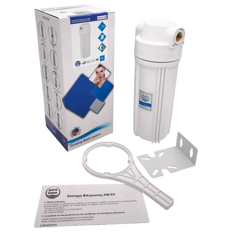 PW-FH-12W, πρόκειται για κάνιστρο 10" που Μπορεί να συνδεθεί κάτω από τον πάγκο της κουζίνας σε σειρά στην κρύα παροχή για την απομάκρυνση στερεών σωματιδίων, αποχλωρίωση, μείωση βαρέων μετάλλων κλπ. Επίσης τοποθετείτε στην κεντρική παροχή όταν υπάρχει έκθεση σε ηλιακή ακτινοβολία. Η διατομή των φίλτρων 1/2" ευνοεί τη μεγάλη παροχή νερού. H αυξημένη αντοχή τους σε υψηλή πίεση επιτρέπει την εγκατάστασή τους σχεδόν σε κάθε οικία. Διαθέτει κλειδί σύσφιξης, βάση ανάρτησης και βίδες επιτοίχιας ανάρτησης. Συνήθως εξοπλίζεται με φίλτρα στερεών για την αφαίρεση χώματος, σκουριάς και άμμου και φίλτρα ενεργού άνθρακα για βασική αποχλωρίωση του νερού. Δέχεται όλα τα ανταλλακτικά φίλτρα 10". Πριν την αγορά τους, βεβαιωθείτε πως έχετε πρόσβαση στην κεντρική σωλήνωση νερού ύδρευσης της οικίας σας και για την εγκατάστασή τους θα ήταν καλό να απευθυνθείτε σε επαγγελματία υδραυλικό. Η τακτική συντήρησή τους (αλλαγή φίλτρων) είναι επίσης σημαντική ώστε να αποφευχθεί η πτώση της πίεσης νερού στην οικία σας.