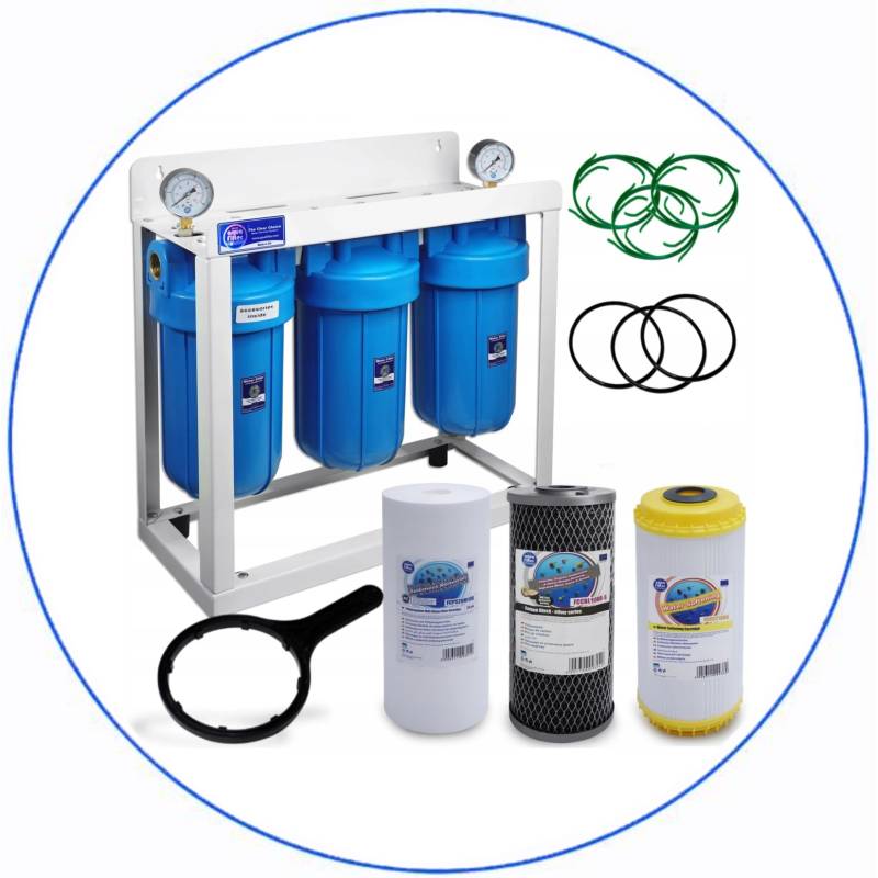 Το σύστημα αποτελείται από μια τριπλή φιλτροθήκη η οποία τοποθετείται στην κεντρική παροχή σας και περιλαμβάνει τα εξής φίλτρα: