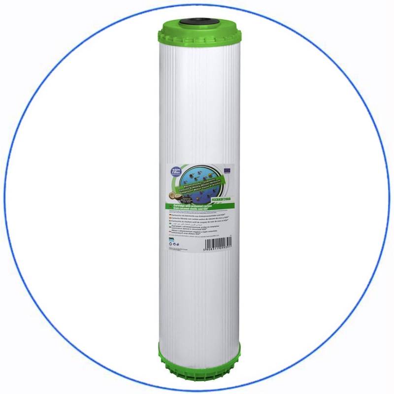 Big Blue 20"X4,5" Φίλτρο Κοκκώδες Ενεργού Άνθρακα GAC+KDF FCCBKDF20BB της Aqua Filter. Τα φίλτρα ενεργού άνθρακα GAC FCCBKDF 20BB παρέχουν μέγιστη προστασία από το χλώριο, τα φυτοφάρμακα και άλλους οργανικούς ρυπαντές, καθαρίζοντας αποτελεσματικά το νερό που διέρχεται από αυτούς, βελτιώνοντας συνάμα την γεύση και την οσμή του.
