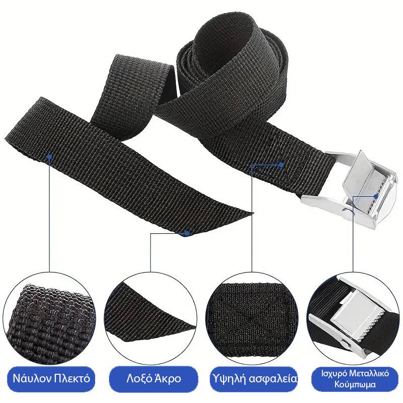 Κατασκευασμένο από νάυλον με ισχυρές ραφές. Στο ένα άκρο διαθέτει μεταλλικό κούμπωμα σε μορφή κλιπ για εύκολη χρήση και μεγαλύτερη ασφάλεια και σταθερότητα του φορτίου.
