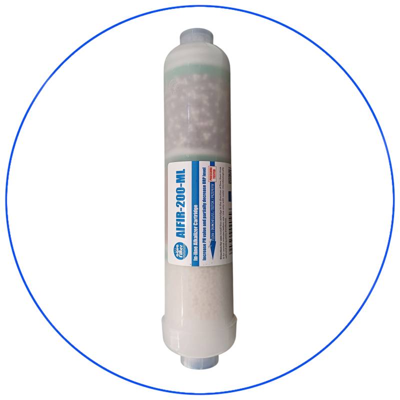 7ο στάδιο: Φίλτρο εμπλουτισμού AIFIR-200-ML Εμπλουτίζει το νερό με τα στοιχεία τα οποία έχουν αφαιρεθεί κατά τη διάρκεια της αντίστροφης όσμωσης. Εμπλουτίζει το νερό με μεγάλη ποσότητα ασβεστίου, μαγνησίου, νατρίου, καλίου, σελήνιο και άλλα ιχνοστοιχεία απαραίτητα για την ορθή λειτουργία του οργανισμού. Παράγει αλκαλικό νερό με πλήρη ισορροπία του ph. Μετατρέπει το όξινο νερό σε νερό αλκαλικών ιόντων ασβεστίου. Απορροφάται εύκολα από το ανθρώπινο σώμα γιατί διαθέτει μικρά δομημένα μόρια τα οποία βοηθούν το ανθρώπινο σώμα να δέχεται περισσότερο νερό και να αναπληρώνει γρήγορα το χαμένο νερό. Συνήθως εγκαθίσταται σε συστήματα αντίστροφης όσμωσης για να προσθέσει τα κατάλληλα ιχνοστοιχεία.