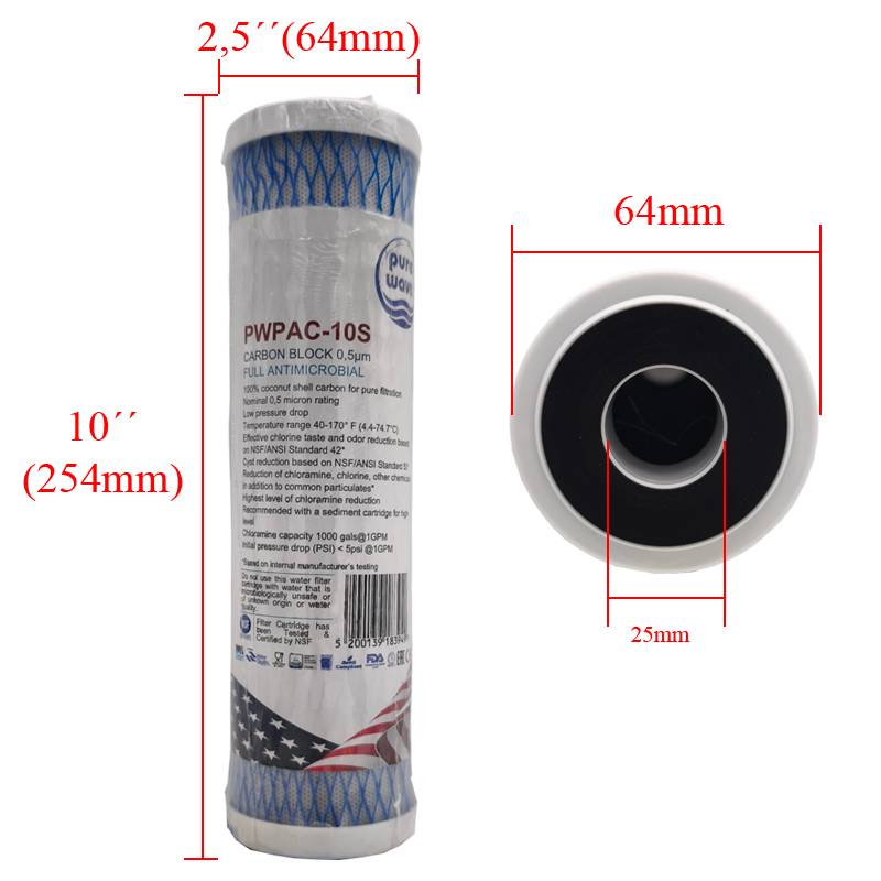 Φίλτρο Συμπαγούς Ενεργού Άνθρακα PWPAC-10S της Purewave, το φίλτρο ενεργού συμπαγούς άνθρακα από πρώτες ύλες υψηλής ποιότητας με πλήρες αντιμικροβιακή δράση. Το φίλτρο PWPAC-10S της Purewave, το οποίο είναι κατασκευασμένο από 100% κέλυφος καρύδας, προσφέρει προστασία από μια σειρά μολυσματικών παραγόντων του νερού βρύσης, με έμφαση στην αποτελεσματική απομάκρυνση του μόλυβδου καθώς και των κυστών έως και 0,5 micron. Το συστατικό μπλοκ άνθρακα που περιέχει απομακρύνει αποτελεσματικά βαρέα μέταλλα, όπως μόλυβδο, χαλκό, υδράργυρο και στρόντιο.