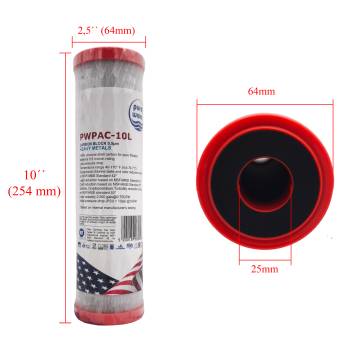 Φίλτρο ενεργού συμπαγούς άνθρακα από πρώτες ύλες υψηλής ποιότητας με πλήρες αντιμικροβιακή δράση. Το φίλτρο PWPAC-10L της Purewave, το οποίο είναι κατασκευασμένο από 100% κέλυφος καρύδας, προσφέρει προστασία από μια σειρά μολυσματικών παραγόντων του νερού βρύσης, με έμφαση στην αποτελεσματική απομάκρυνση του μόλυβδου καθώς και των κυστών έως και 0,5 micron. Το συστατικό μπλοκ άνθρακα που περιέχει απομακρύνει αποτελεσματικά βαρέα μεταλλα, όπως μόλυβδο, χαλκό, υδράργυρο και στρόντιο.